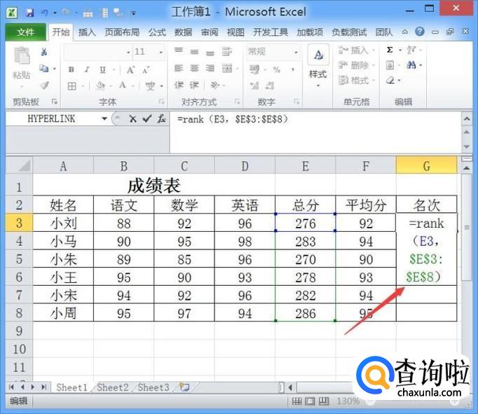 输入好参数之后按下回车键我们就得到了计算的结果,然后将鼠标左键移到该单元格的右下角然后拖动鼠标左键就将所有人的平均分都计算出来了,然后选择名次单元格在名次里输入函数,如图所示: