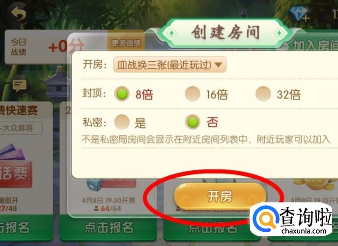 进入后,可以设置一下翻倍的倍数和封顶多少,创建的房间最好是私密的,这样进入房间就需要密码,附近的人就不会加进来啦,设置完成后,点击【开房】就可以啦。