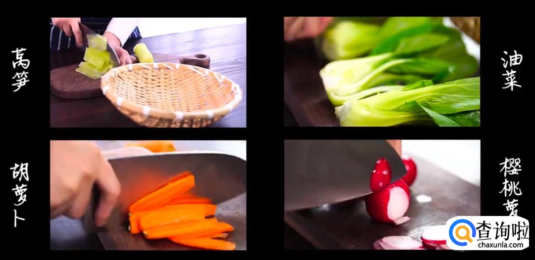 莴笋切片,上海青切半,胡萝卜,樱桃萝卜切片,起一锅沸水。