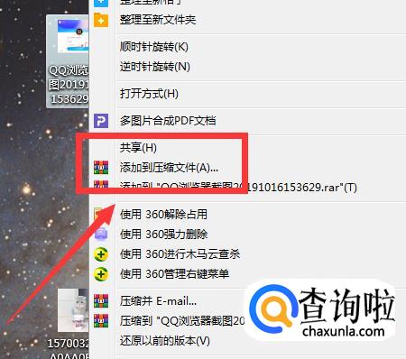 在桌面右键点击该图片,这样就打开了文件选择列表,点击下方的【添加到压缩文件夹】。