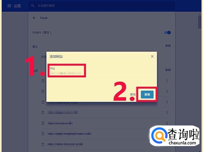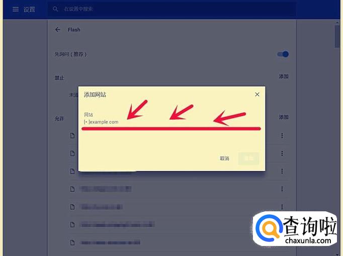 这时会弹出一个操作框,在横线位置,鼠标单击一下,然后输入我们需要启用flash的网站的网址。