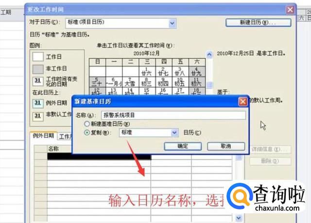 在弹出的新建日历界面中给日历起一个名称,然后选择复制,设置下拉框为标准选项,如下图所示