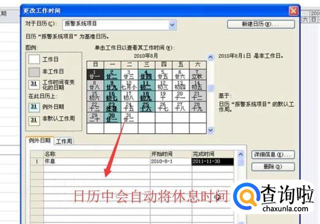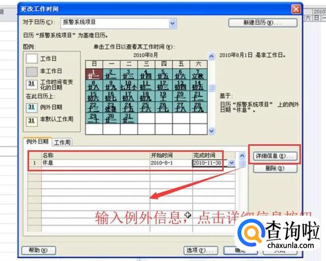 接下来在例外信息栏目中输入休息的跨度时间,这里设置成项目时间即可,如下图所示,然后点击详细信息按钮