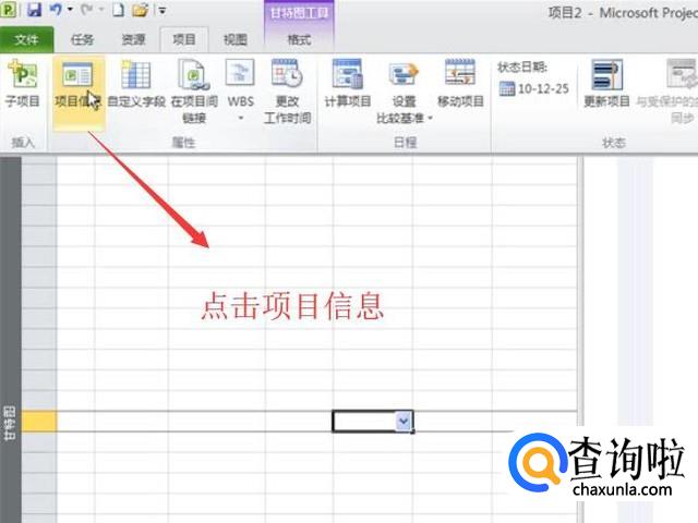 首先打开Project 2010软件,点击顶部的项目菜单,选择二级菜单中的项目信息,如下图所示