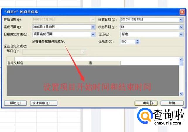 接下来在弹出的项目信息界面中我们首先需要设置一下项目的开始时间和结束时间,如下图所示