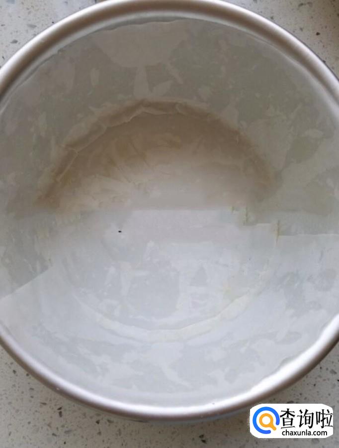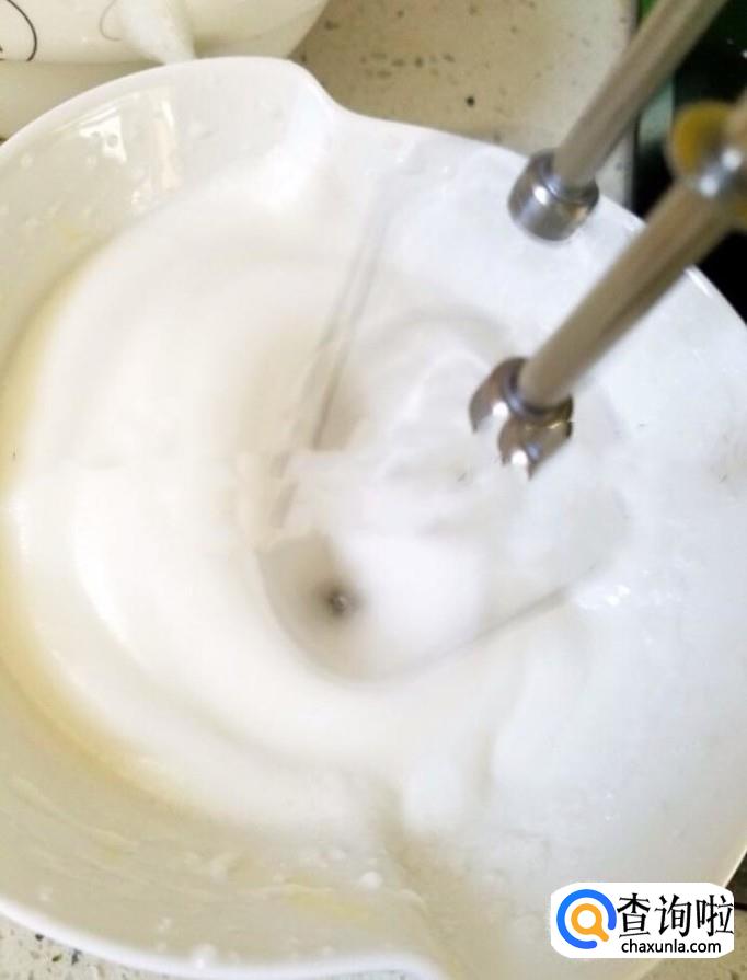 然后我们开始打发蛋清,把三个蛋清放入无水无油的容器中,滴几滴白醋,用打蛋器打发至定型