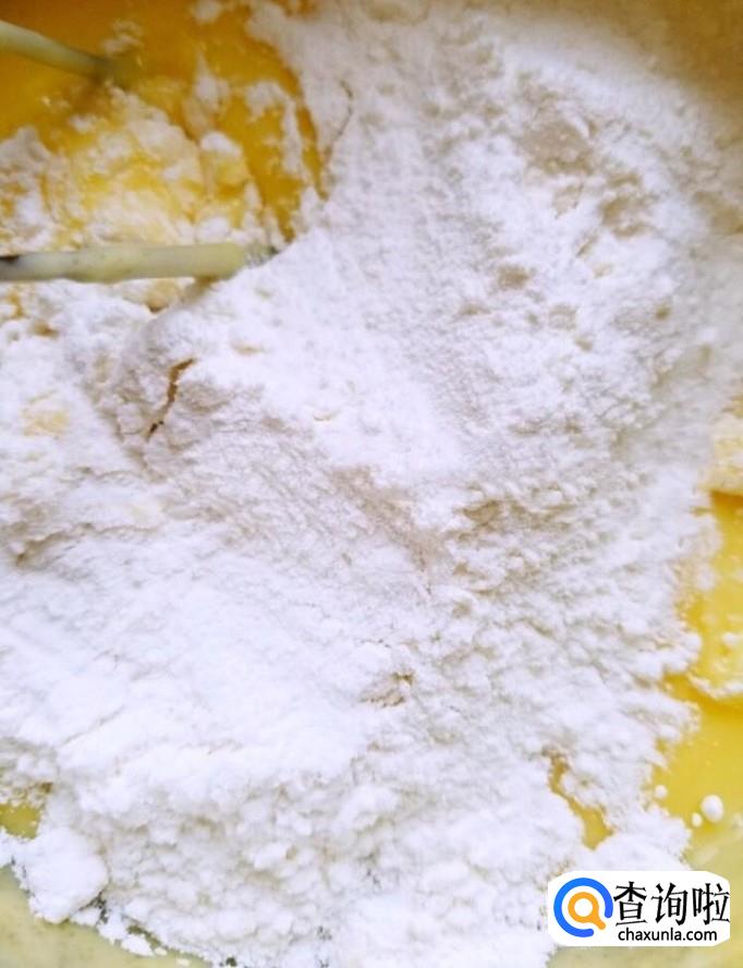 接着我们把低筋面粉筛入其中,上下翻拌均匀,翻拌至无颗粒