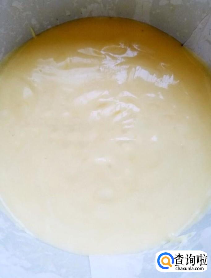 然后我们在模具中铺一层不沾纸,再刷上一层黄油,姜蛋糕糊倒入模具中,轻轻地震几下,震出大泡