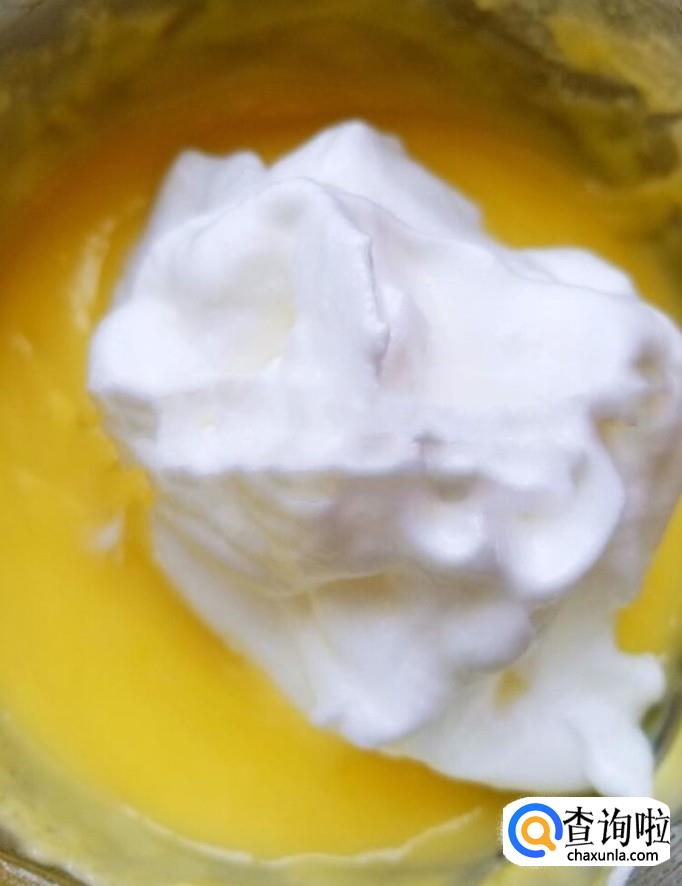 将打发好的蛋清分三次倒入蛋黄糊中,上下翻拌均匀