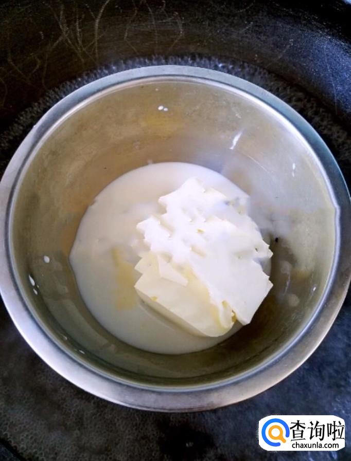 首先我们把牛奶和奶油奶酪放入一个容器中,放入热水锅中隔水加热,搅拌至完全融化