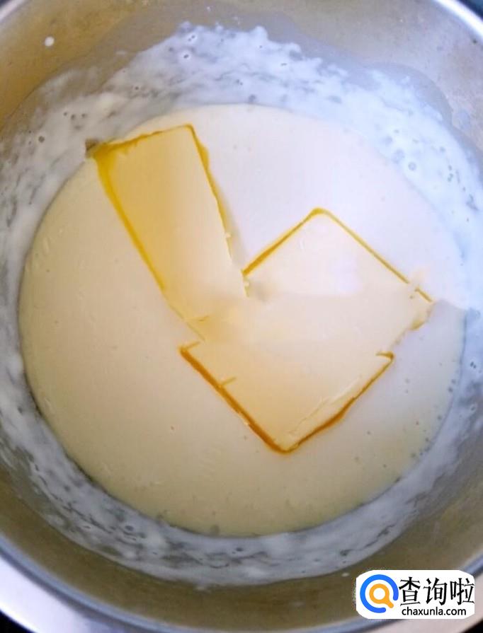 然后再将黄油放入其中,同样隔水加热,搅拌至完全融化,关火