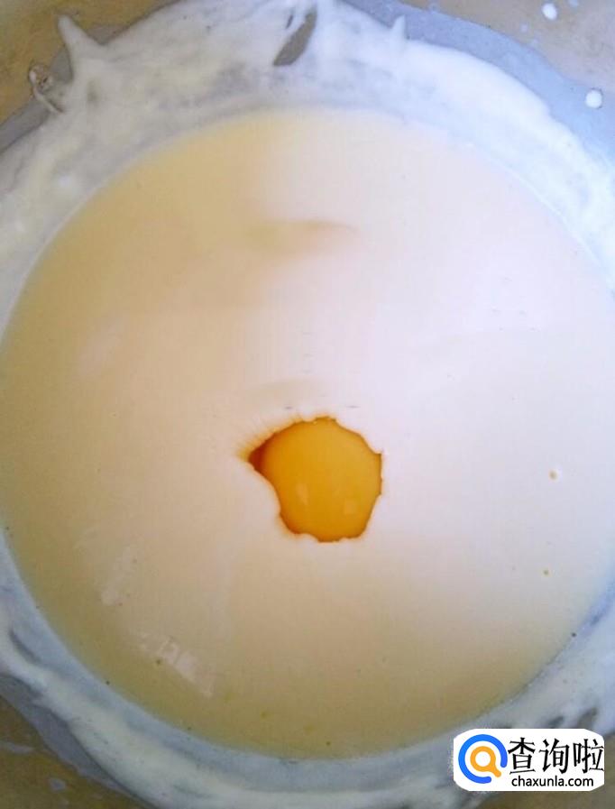 接着我们把容器取出来,放在桌子上,把三个蛋黄依次放入,每次都要搅拌均匀再放下一个