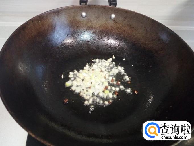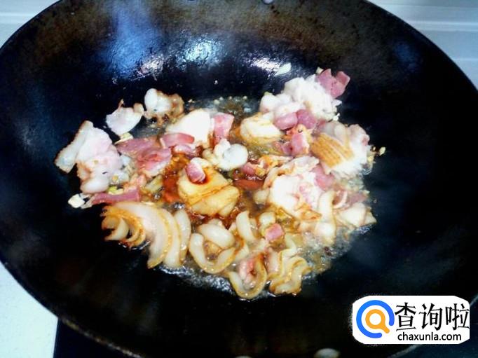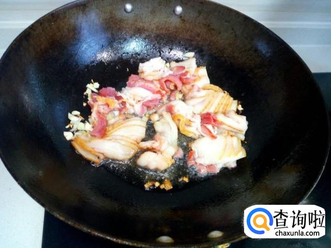锅内放油加热,油热后放入花椒,葱,姜,蒜,爆锅。随即放入培根翻炒。