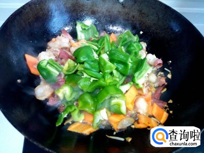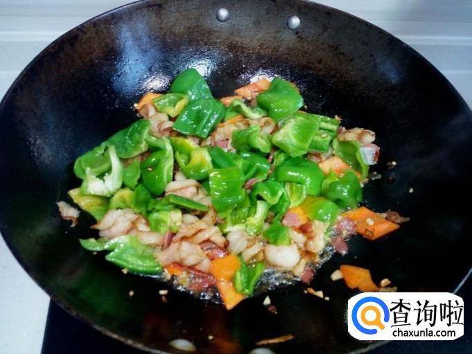 胡萝卜变软后,放入青椒大火爆炒。