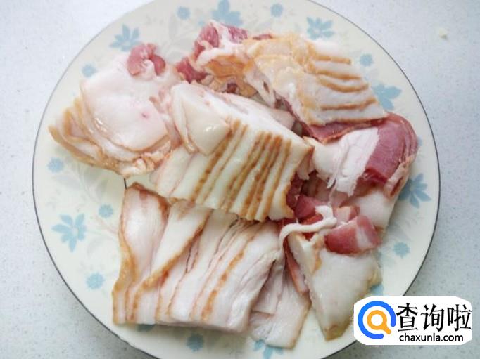 培根切成比青椒大一点的块。培根入锅后下一些油。