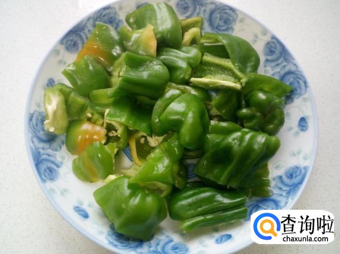 青椒用水洗净,控干水分,切成块,装盘备用。