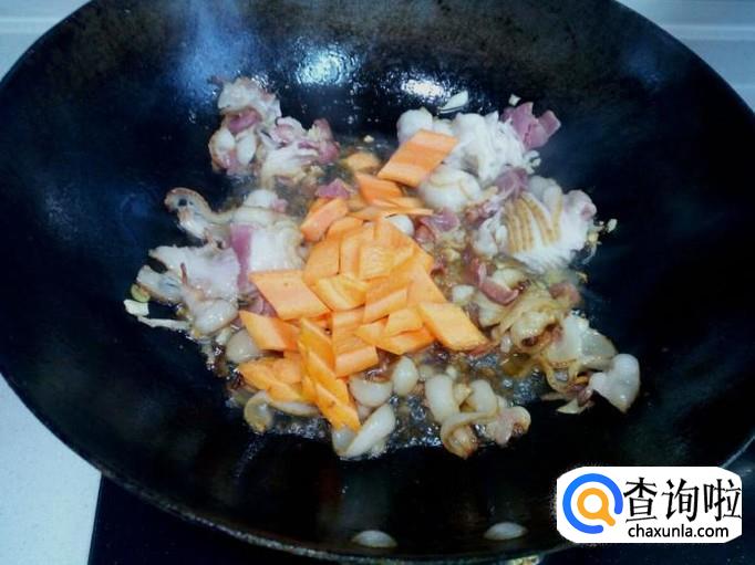 放入少许料酒,酱油,然后放入胡萝卜片翻炒。