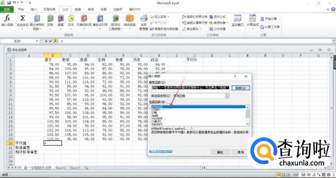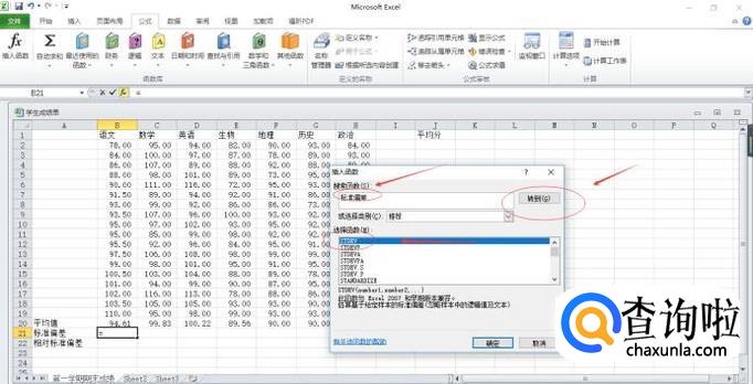点击“插入函数”,在搜索框中输入“标准偏差”,点击“转到”,选中“stadev”函数。