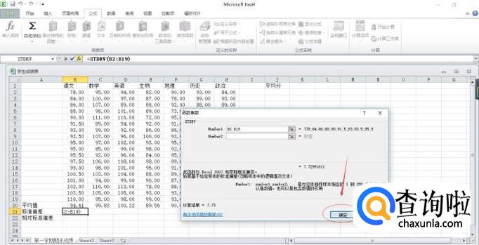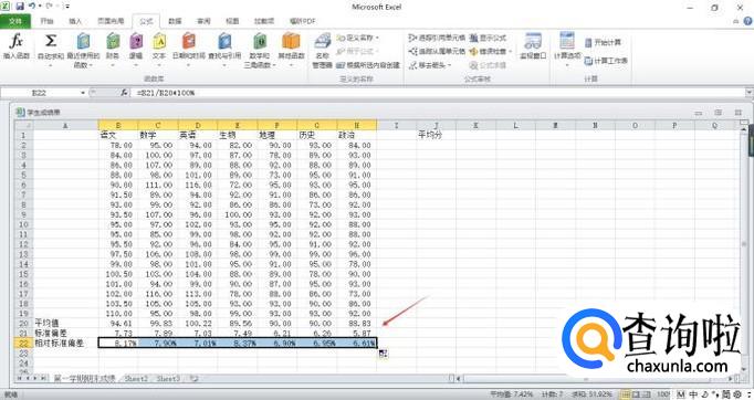 接下来就是求得相对标准偏差了,相对标准偏差=标准偏差/平均值*100%。选中单元格,在单元格中输入公式,按下回车键即可。