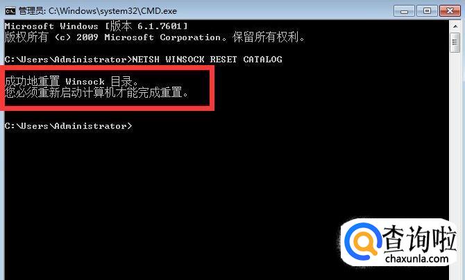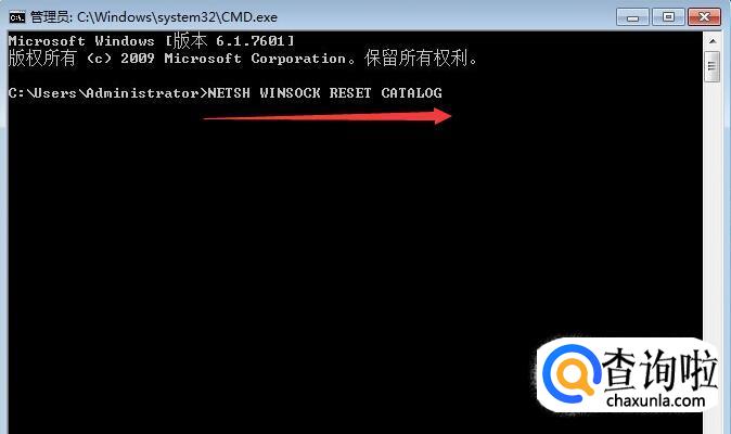 在弹出的程序对话框中,输入:NETSH WINSOCK RESET CATALOG字符串,然后回车。