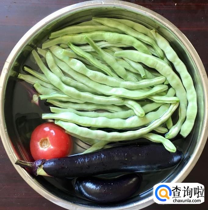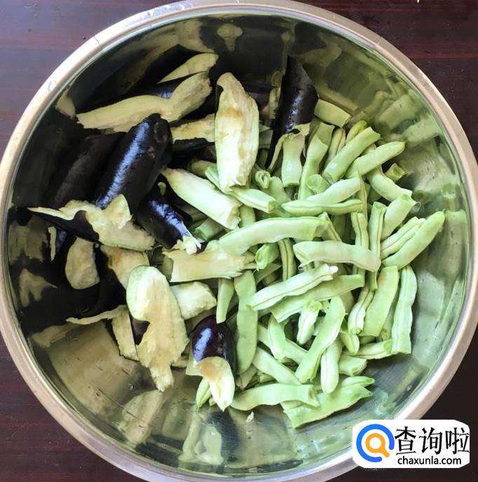 茄子、豆角分别择洗干净后用清水浸泡10分左右,控干水分豆角掰成段、茄子用手撕成大块
