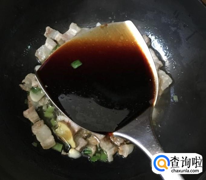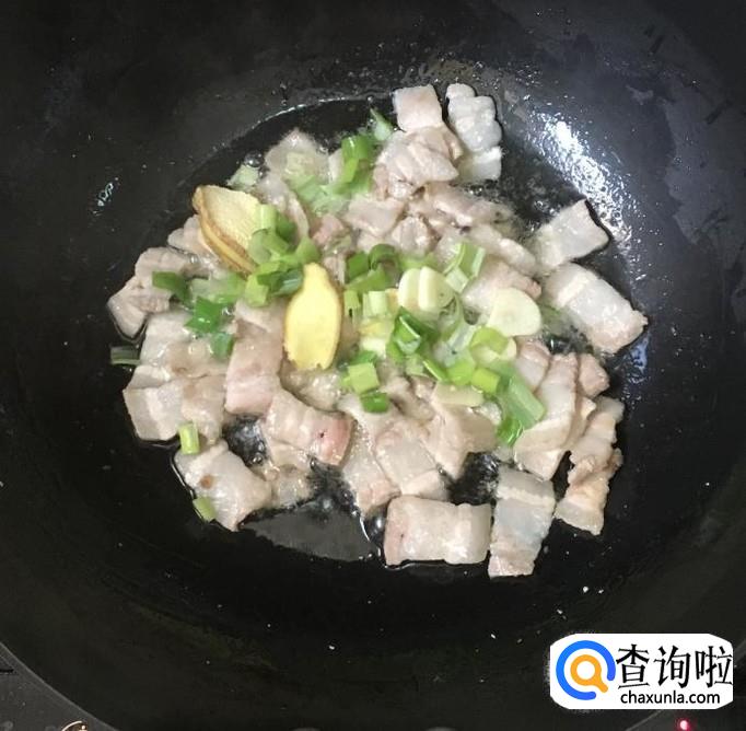 热锅加入适量的花生油把五花肉片炒香后放入葱花、姜片、蒜片爆香,料酒、生抽烹锅