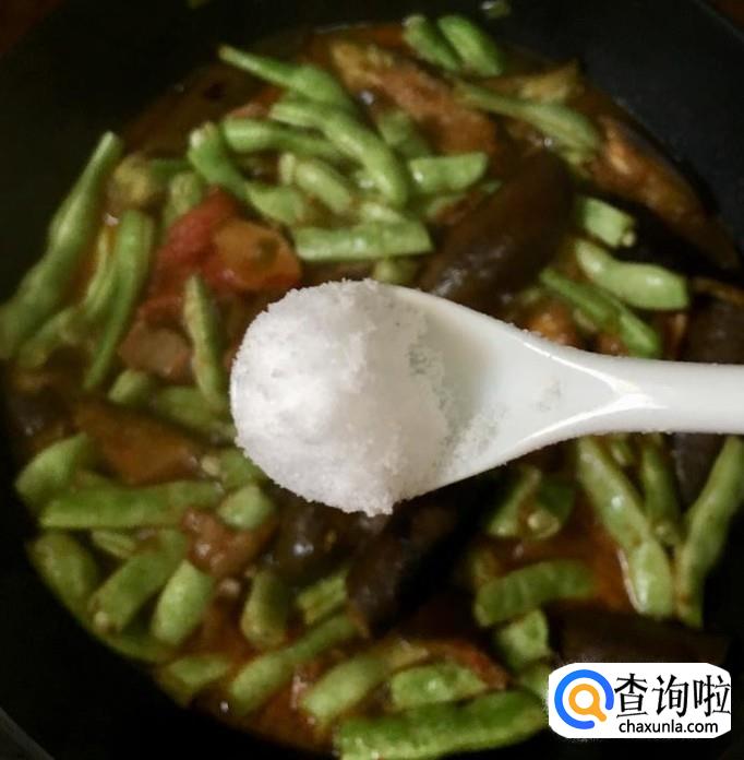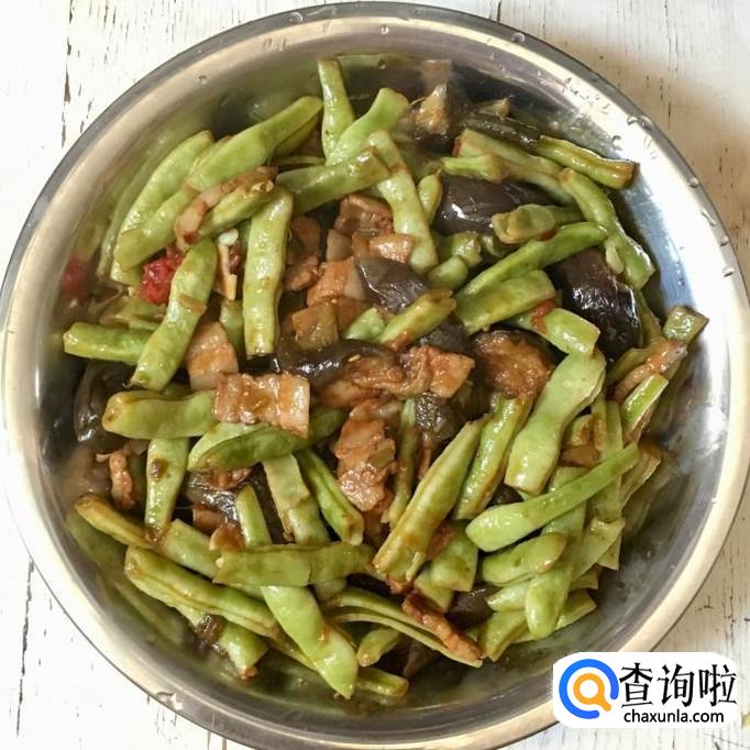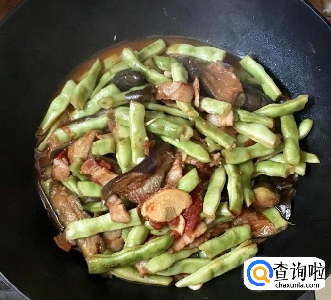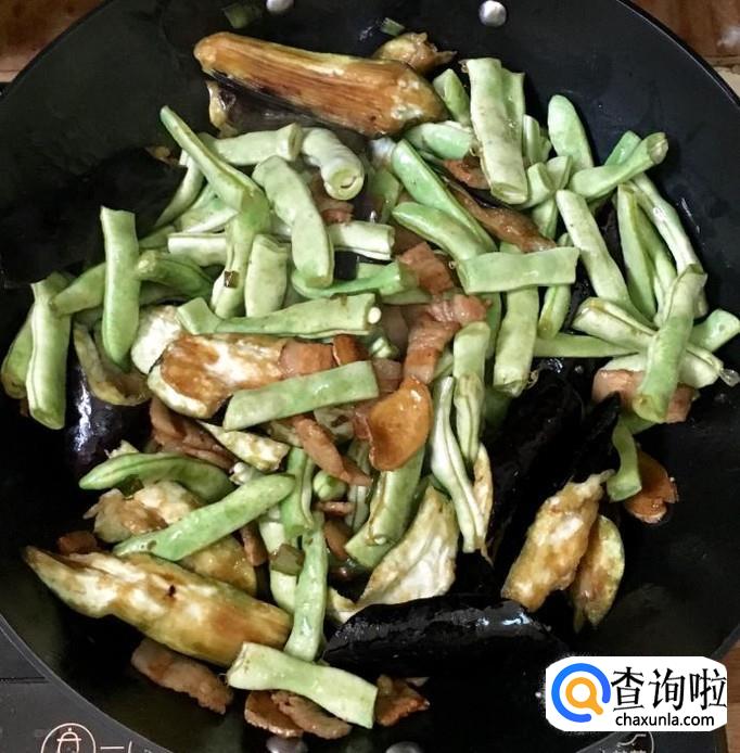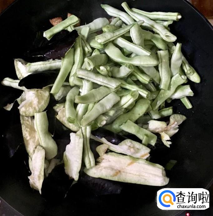 倒入豆角段和茄子块翻炒均匀至变色使其充分吸收油脂