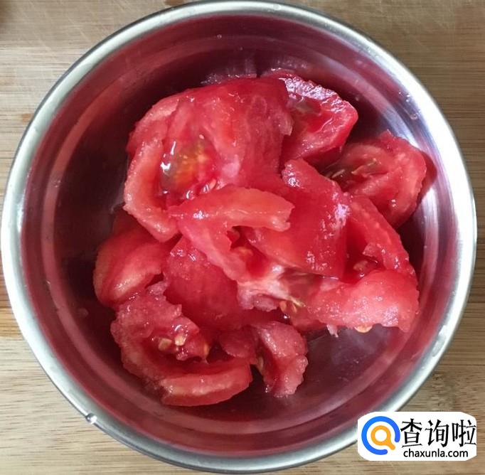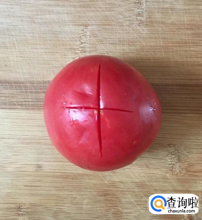 西红柿一个清洗干净从顶部划十字花刀,剥去外皮切成滚刀块备用