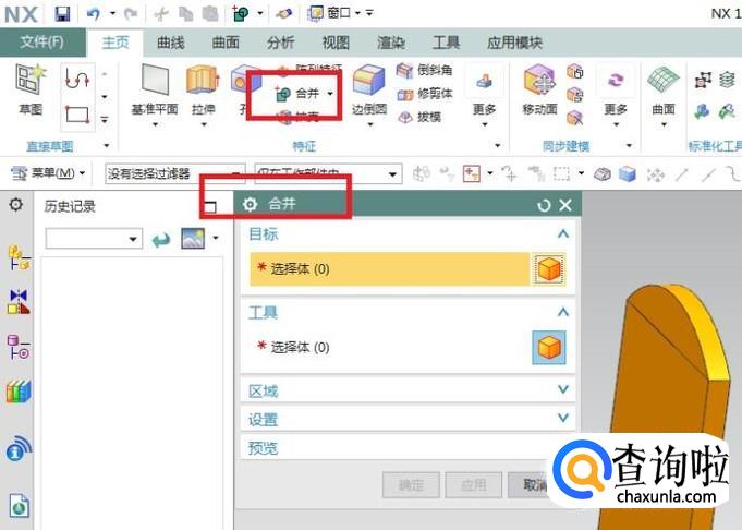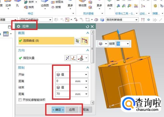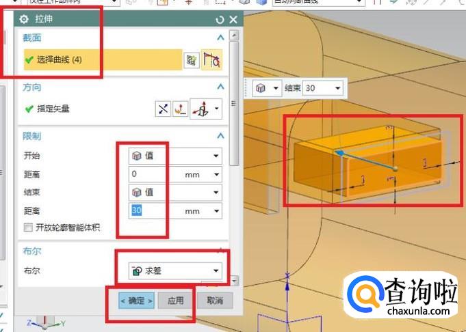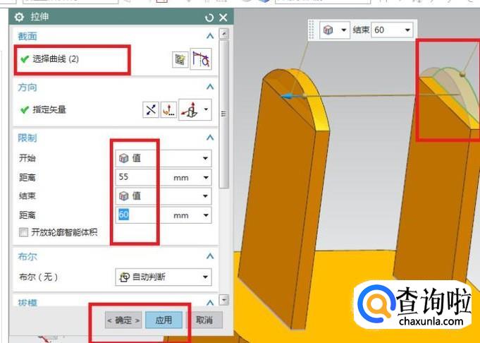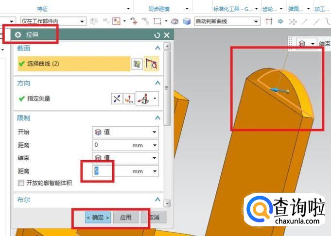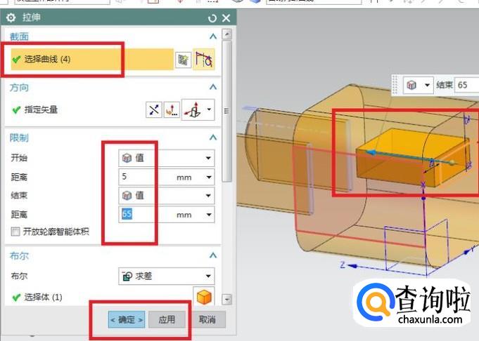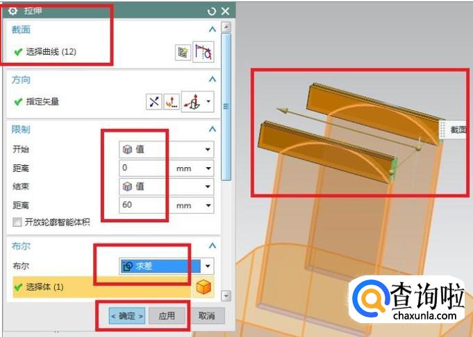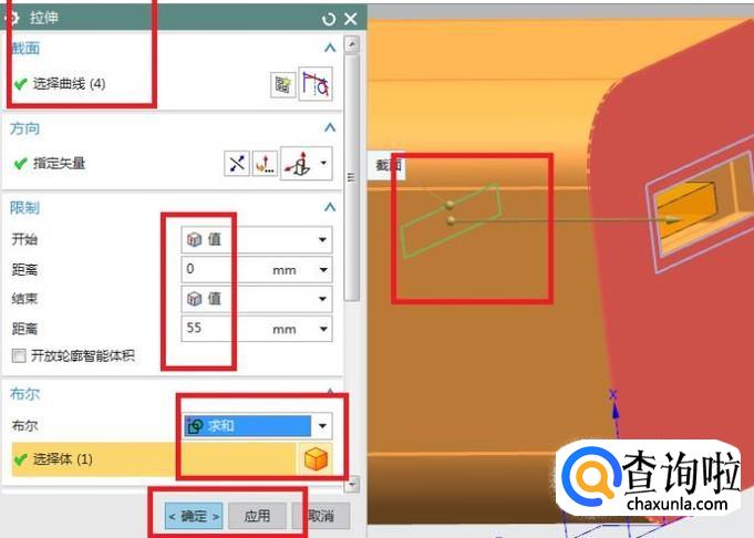 出现的拉伸对话框截面一栏选择刚刚画的矩形草图,
