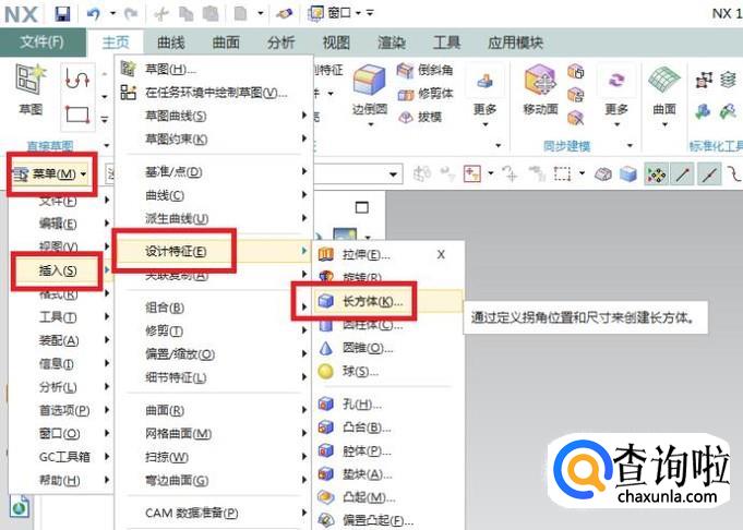 执行【菜单——插入——设计特征——长方体】,