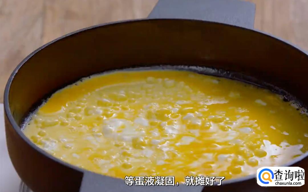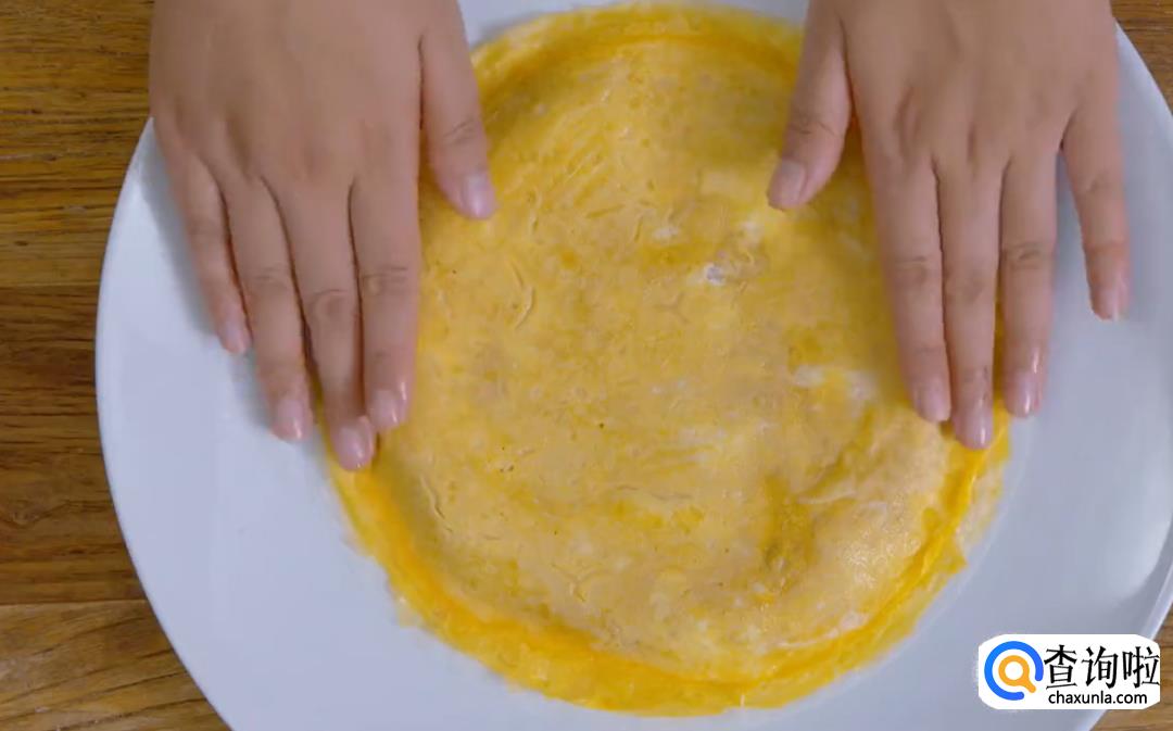 再来摊两张蛋皮,平底锅刷一层油后开小火倒入蛋液,摇锅等蛋液凝固,蛋皮就摊好了。