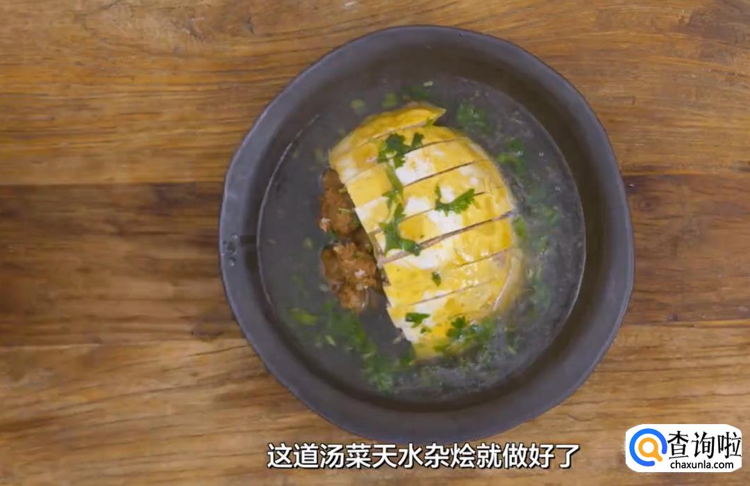 蒸好后取出来倒扣入大盘中,鸡汤烧烤后加入香菜和葱末,撒上盐,然后将鸡汤倒入大盘中即可。