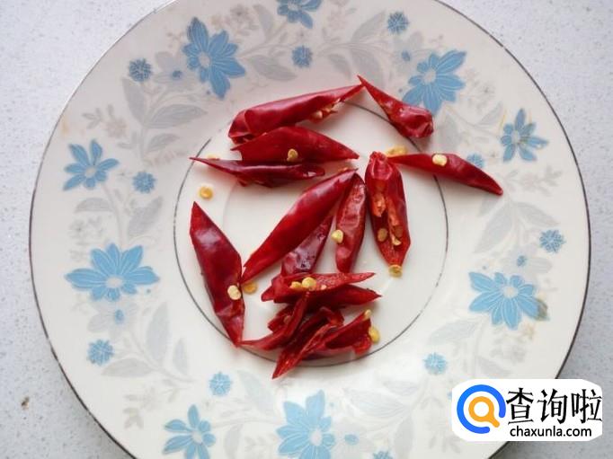 红干椒用水清洗干净,控干水分,斜刀切成段。