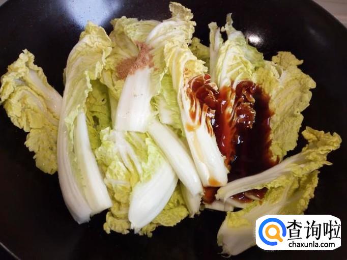 随即放入娃娃菜,放入五香粉,一大匙儿蚝油,少许盐,转大火翻炒。