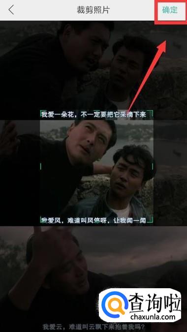 【剪裁照片】的页面,把选择好的图片给剪裁一下合适的大小,剪裁为正方形的,可以随意的把图片给调大和调小,点击右上角的“确定”这一项。