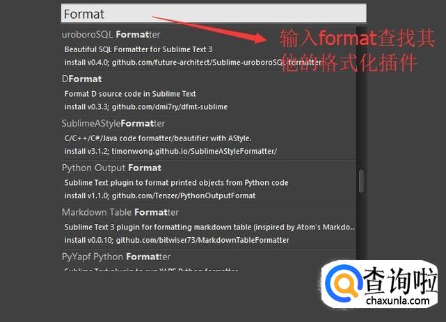 最后如果你想格式化其他类型的代码文件,比如SQL语言的,那么你就需要找针对SQL语言的格式化插件了,这里小编教大家一招,在命令模式中输入Format就可以调出各种语言的格式化插件了,大家自己选择即可