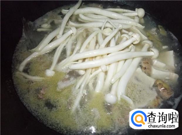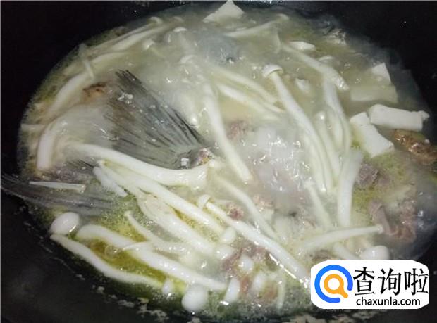 把鱼和豆腐炖开后,再加入海鲜菇,加入适量的盐调味,加入海鲜菇大概煮5分钟左右,即可出锅,享受美味的鱼汤了。