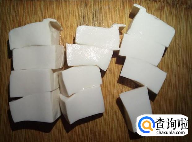 嫩豆腐用流动的水冲洗一下,然后切成小块。