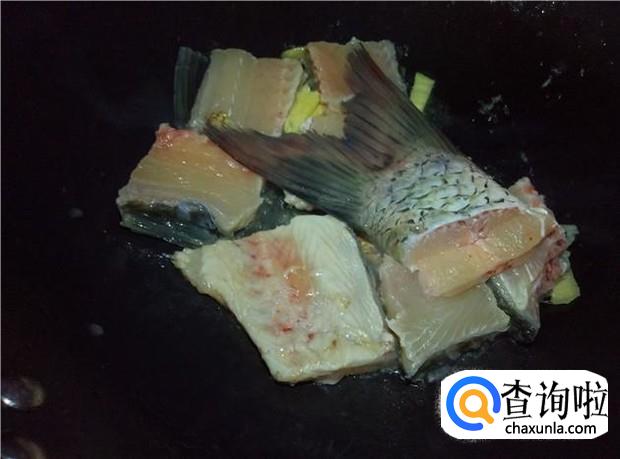 热锅下油,放入姜丝煸香,然后把鱼倒入锅中,中小火煎一下鱼的两面。