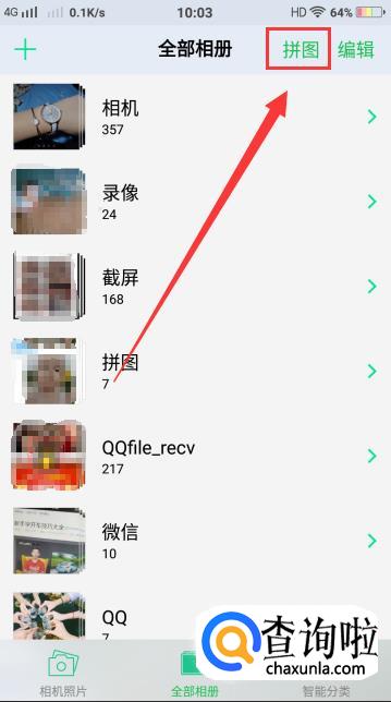 进入后,在【全部相册】页面的右上角就有一个【拼图】,点击【拼图】。