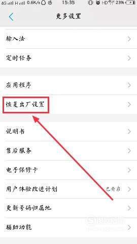 点击“恢复出厂设置”。(当然,轻易不要用这个方法,一旦恢复出厂设置,手机的所有信息都会消失变成新机状态)