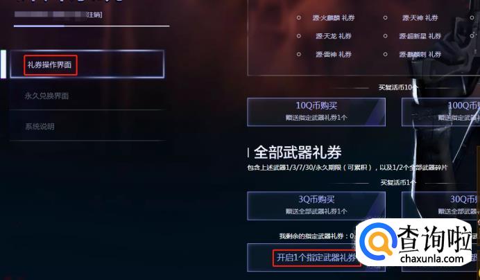 在碎片系统首页点击”礼券操作界面“,然后在页面右下角查看“全部武器礼券”选项,点击开启即可。