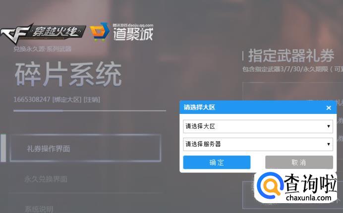 进入碎片系统后登陆CF穿越火线账号,然后绑定大区和服务器,这个一定要填写正确,用哪个账号领取的礼券就用哪个账号登陆碎片系统。