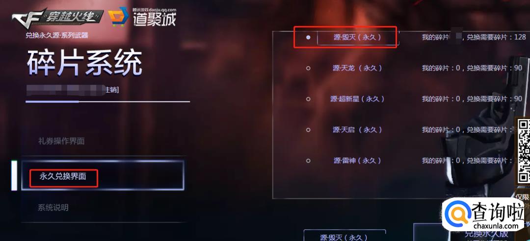 然后点击“永久兑换界面”,只有获得足够数量的碎片后才可以进行兑换;比如源-毁灭需要128个碎片,源-天神需要60个碎片等等。