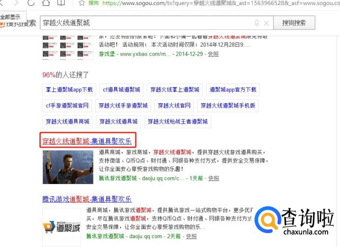 首先我们用电脑打开浏览器,搜狗搜索“穿越火线道聚城”,点击页面上的“穿越火线道聚城-集道具聚欢乐”,进入穿越火线道具城。