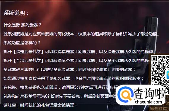 拆开【指定武器礼券】可以获得指定累计期限武器,以及指定武器永久版的兑换碎片;拆开【全部武器礼券】可以获得某个累计期限武器,以及某个武器永久版的兑换。如下图所示。