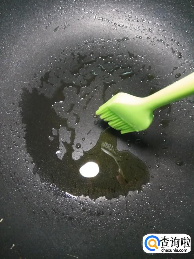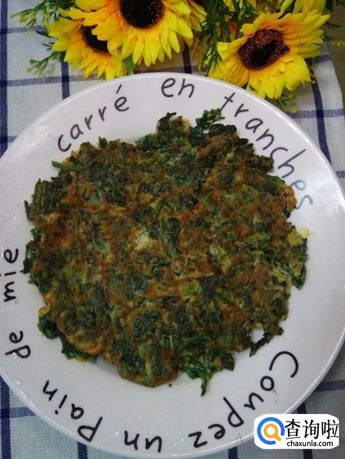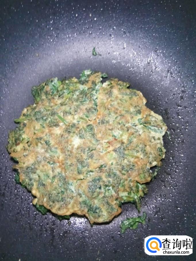 锅中刷油,倒入荠菜鸡蛋液,摊成圆形。