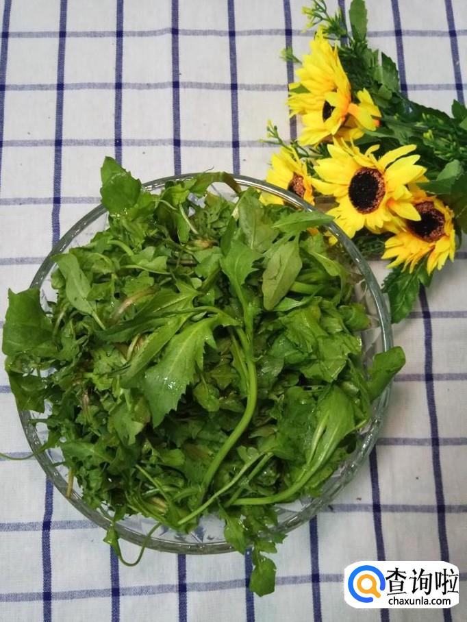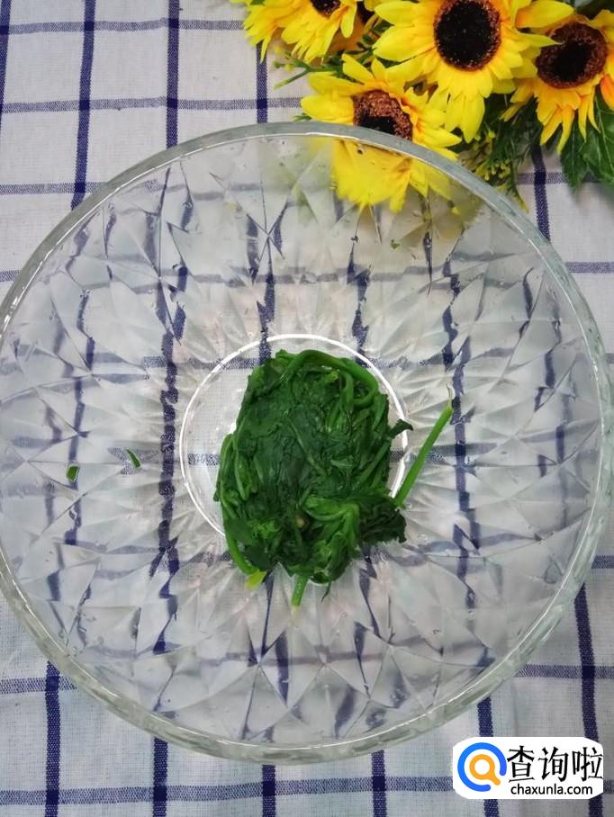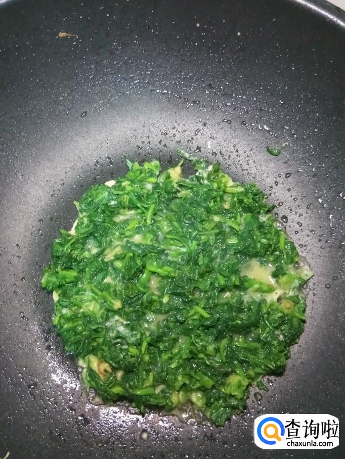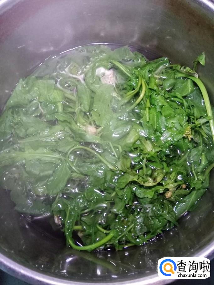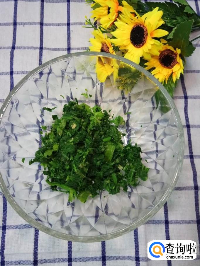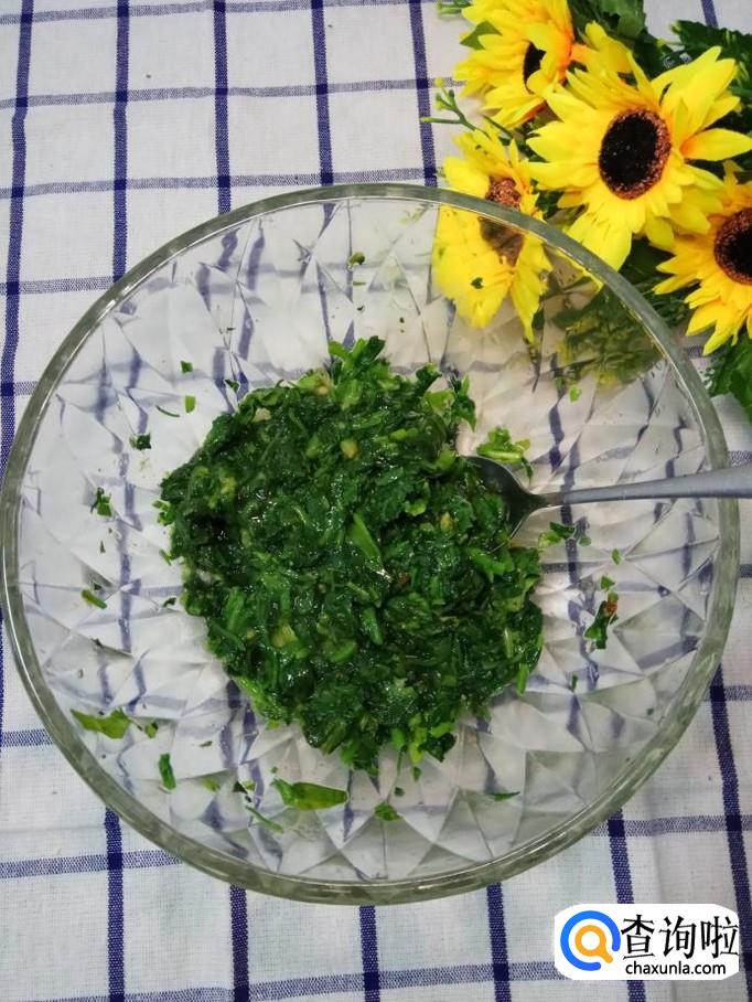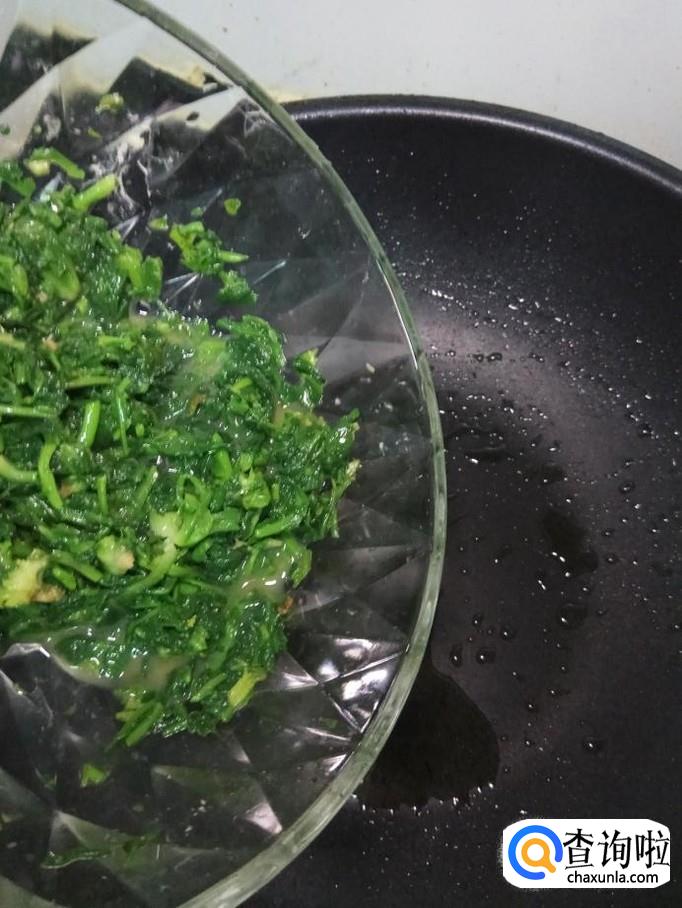 准备新鲜的荠菜洗净,放入锅中焯水,捞出,过凉水攥干水分。注意,野生的荠菜可以提前用凉水泡两个小时再洗。