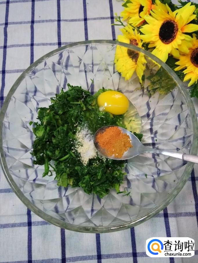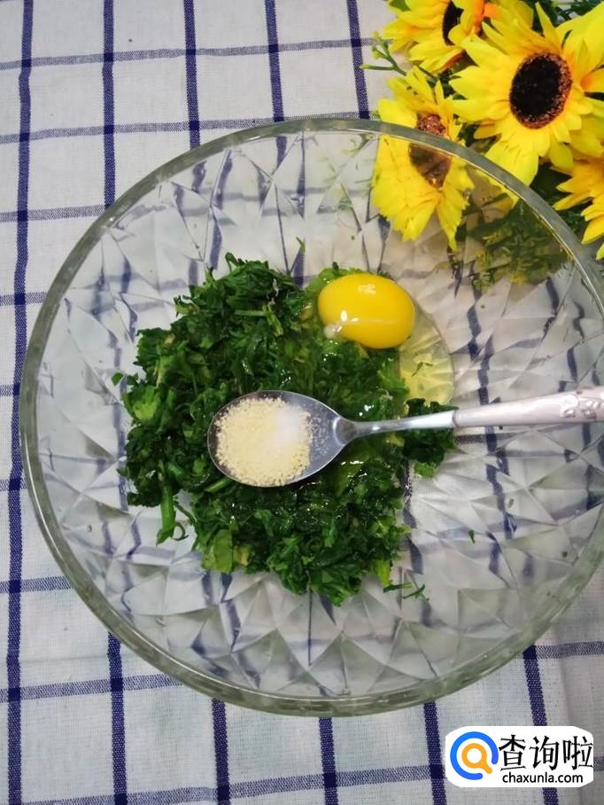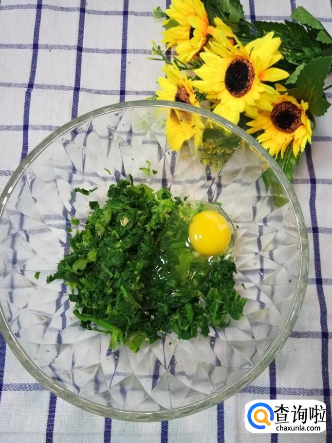 用刀切成碎末,然后打入一个鸡蛋,鸡蛋液可以将荠菜末沾在一起。