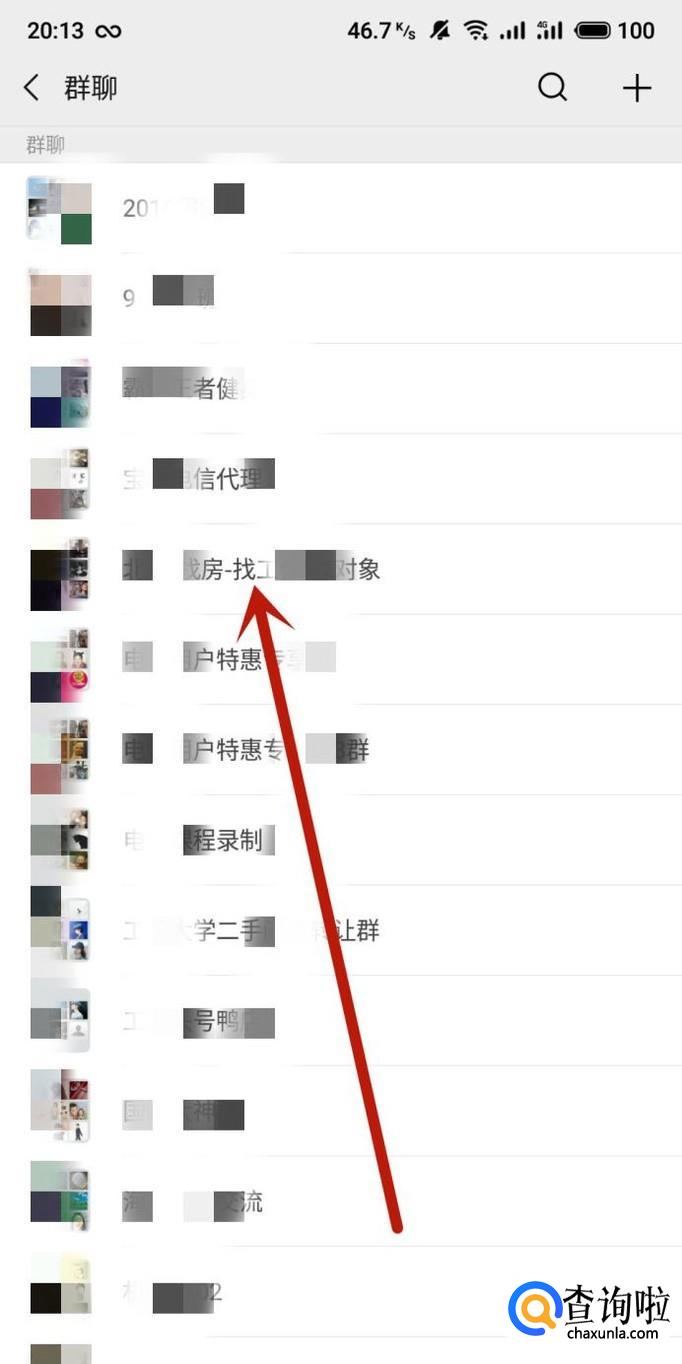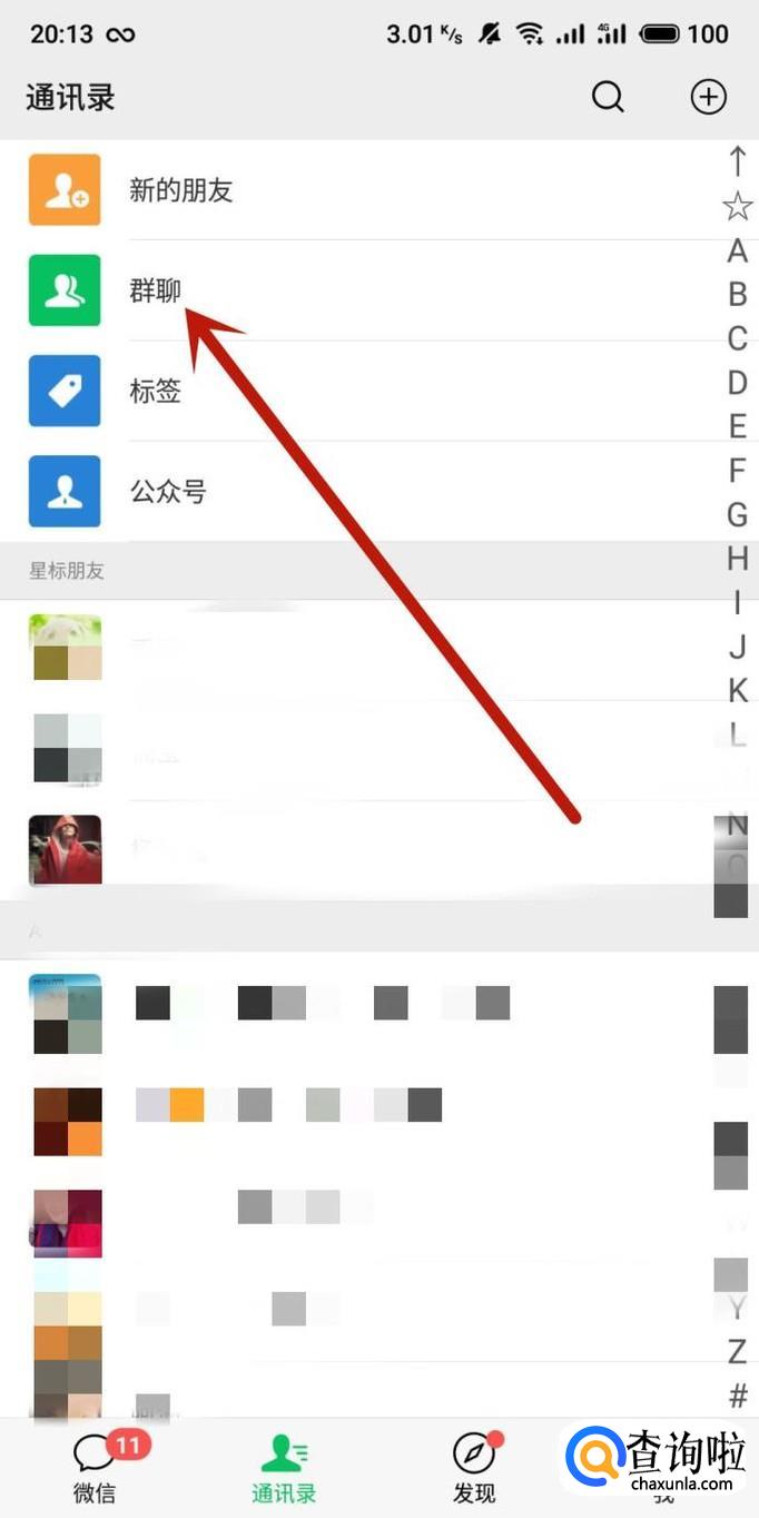 在微信通讯录页面,点击“群聊”,进入下一页面,如图所示。